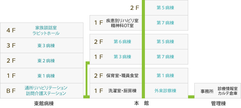 ◎377床 ・一般病棟 29床・療養病棟(療養病棟環境加算I承認)48床 ・精神科病棟 132床 ・認知症治療病棟(I)108床 ・特殊疾患療養病棟(2)60床 |