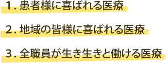 この3つを開設当初からの基本理念として、この病院に入院してよかったと心から喜んでいただける最良の医療と心の安心(安心医療)を実感できるよう、全職員がひとつになって日々努力を重ねています。