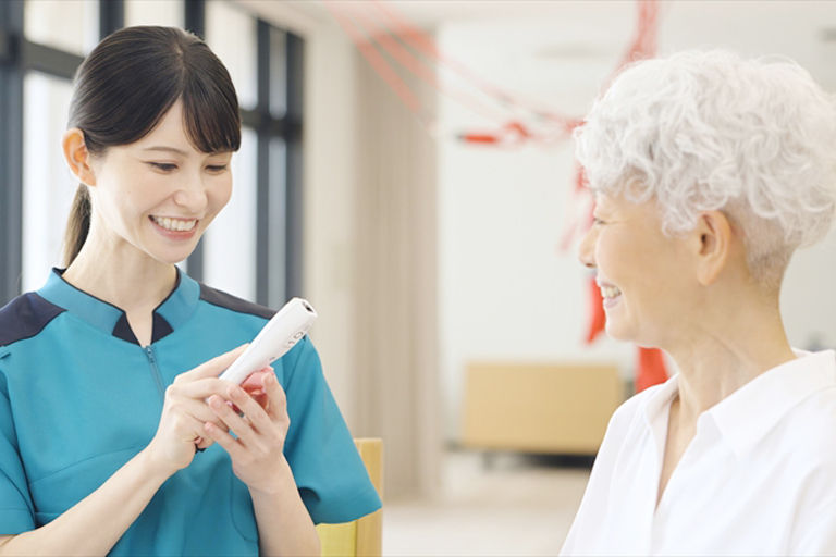 「看護師が毎回、体調を確認します」 施設に到着したら、まずは血圧・脈拍・体温などの測定を行います。