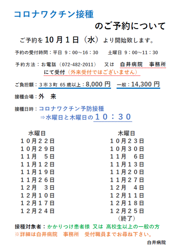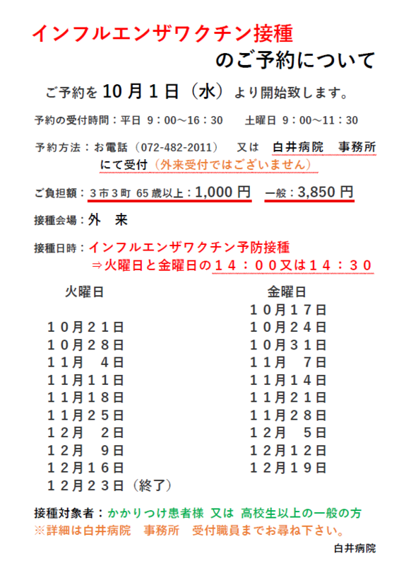 インフルエンザワクチン・コロナワクチン予防接種のR7.10月〜12月のご予約について